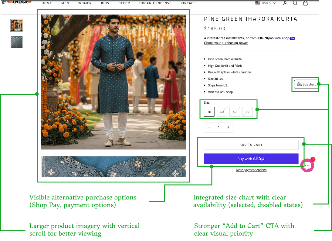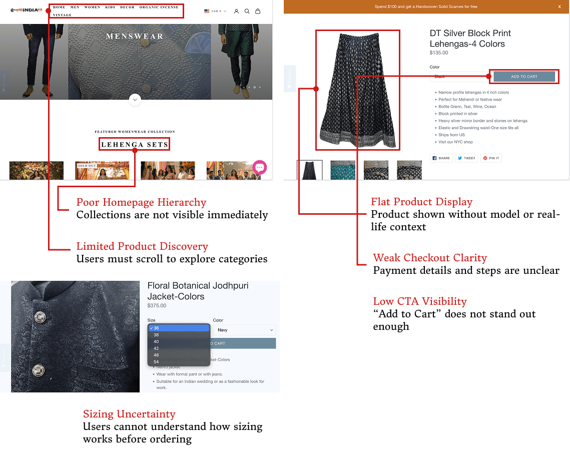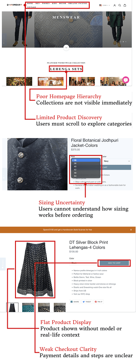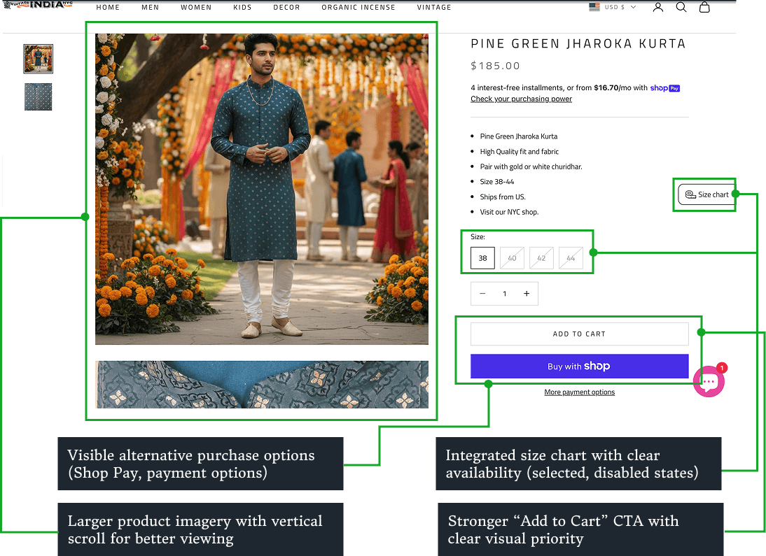 By improving product clarity, sizing guidance, support, and checkout, the Vintage India NYC experience became more intuitive and confidence-driven.